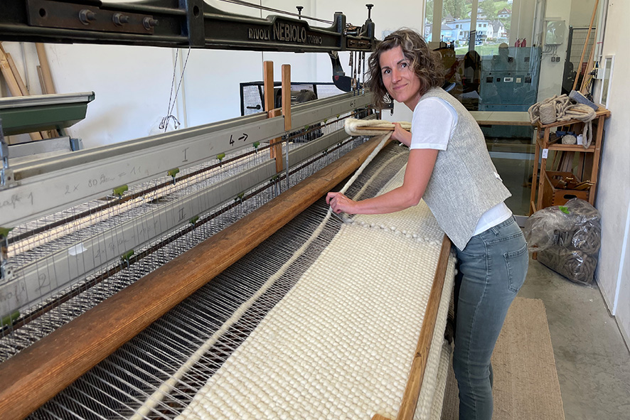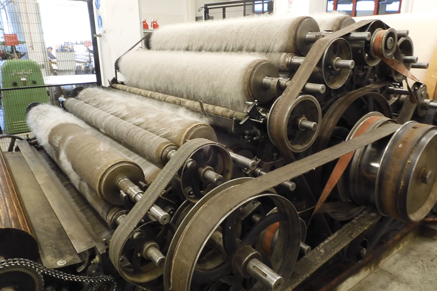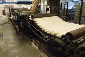 Als nächstes geht es zur Wollwäsche. Mit Waschsoda und warmem Wasser wird die Wolle gespült, um Schmutz und einen Teil des Fettes auszuwaschen. Dabei darf sie nicht bewegt werden, um nicht vorzeitig zu verfilzen. Nach dem Trocknen erreicht die Wolle das Herzstück unserer Manufaktur: den 13-Meter-langen Krempel, der bereits seit über hundert Jahren Wolle zu Vlies kardiert. Diese äußerst robuste und beeindruckende Maschine reißt und kämmt die Wollfasern zunächst in eine dann in die andere Richtung, bis ein loses Vlies entsteht. Das Vlies kann zum Stopfen oder Füllen verwendet werden. Wir selbst nähen daraus unsere Betten und Polster mit Baumwollbezug und reiner Schafwollfüllung. Alternativ kann das Vlies vom Krempel in Stränge geschnitten und zu einem handgewebten Teppich verarbeitet werden.