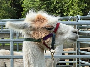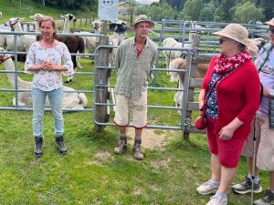Für diese Seniorinnen und Senioren haben Caroline und Chris ihre Lamas besonders schön geschoren. In einer kurzen Einschulung erfahren die Lamawanderer, dass die Tiere sehr höfliche, vornehme, aber auch neugierige Tiere sind. Jedes hat seinen eigenen Namen. Auf die Frage nach dem Spucken der Tiere erfahren sie, dass dies nur bei Eifersucht oder Futterneid passieren kann.