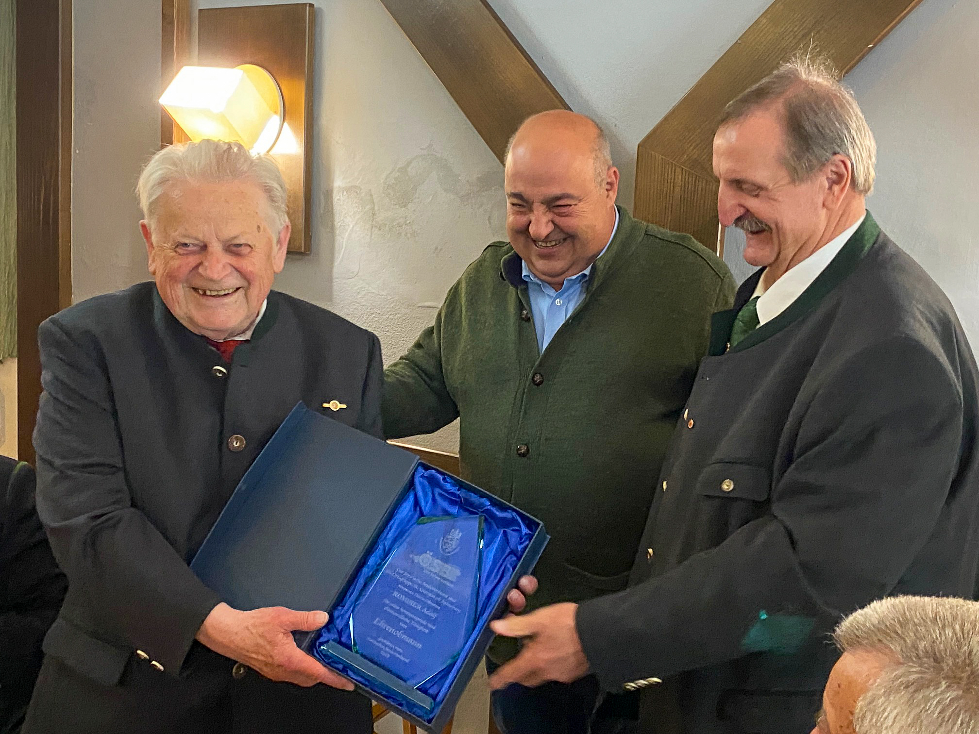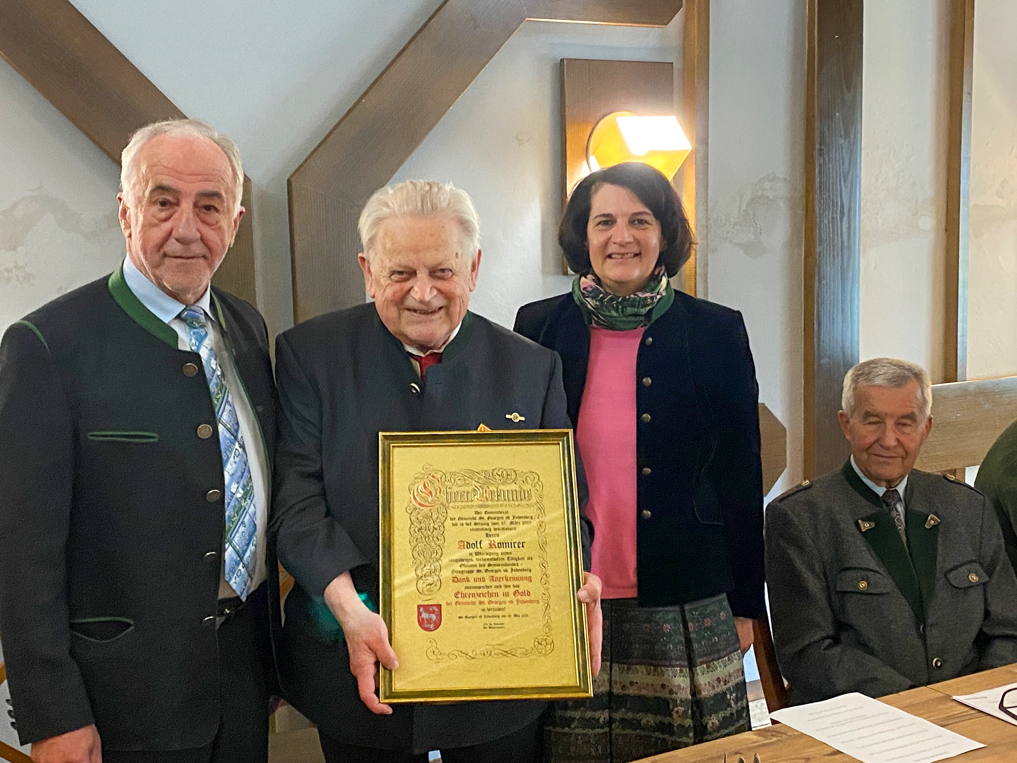Bürgermeister Hermann Hartleb zeichnete Adolf Romirer für seine lange Arbeit als Obmann und für seine jahrelange Tätigkeit als Essen-auf-Rädern-Zusteller mit der St. Georgener Ehrennadel aus und Reinhard Honis erhielt vom Landesgeschäftsführer Fritz Roll die Goldene Ehrennadel des Seniorenbundes.