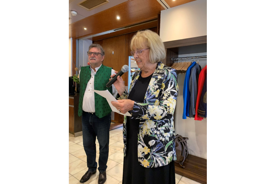 Margarethe Karf – flotte 85 – ließ es sich nicht nehmen ein heiter ironisches Gedicht über das Älterwerden gekonnt vorzutragen. Mit Kultur und Literatur ging es weiter. Die Autorin Ingeborg Wölkart, sie hat schon viele Bücher geschrieben, ist quasi ein Stammgast. Ihre Gedichte und Kurzgeschichten regen zum Schmunzeln und Nachdenken an. Als sie hörte Hans will aufhören hat sie extra ein Gedicht für ihn geschrieben. Daraus die letzten zwei Zeilen: