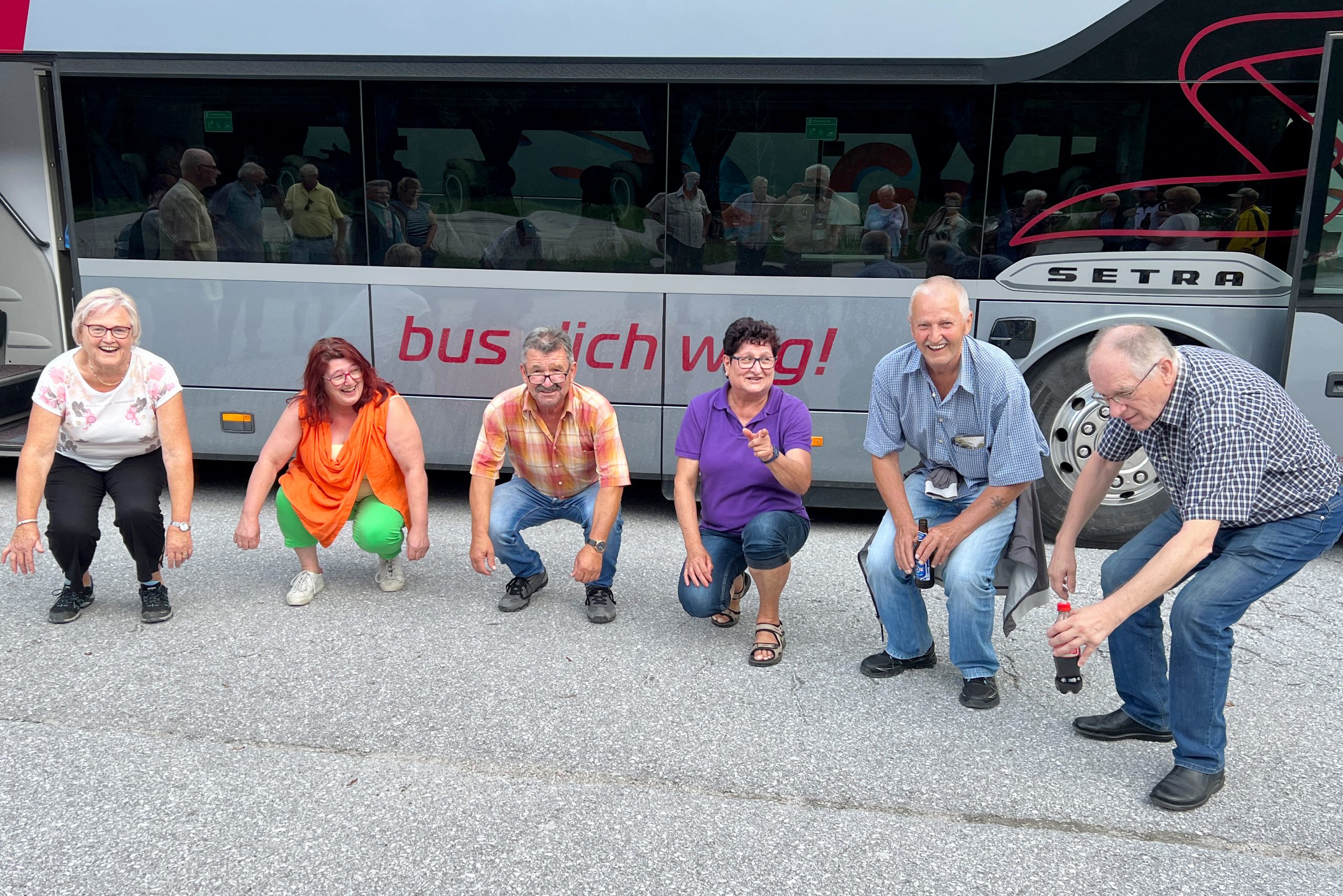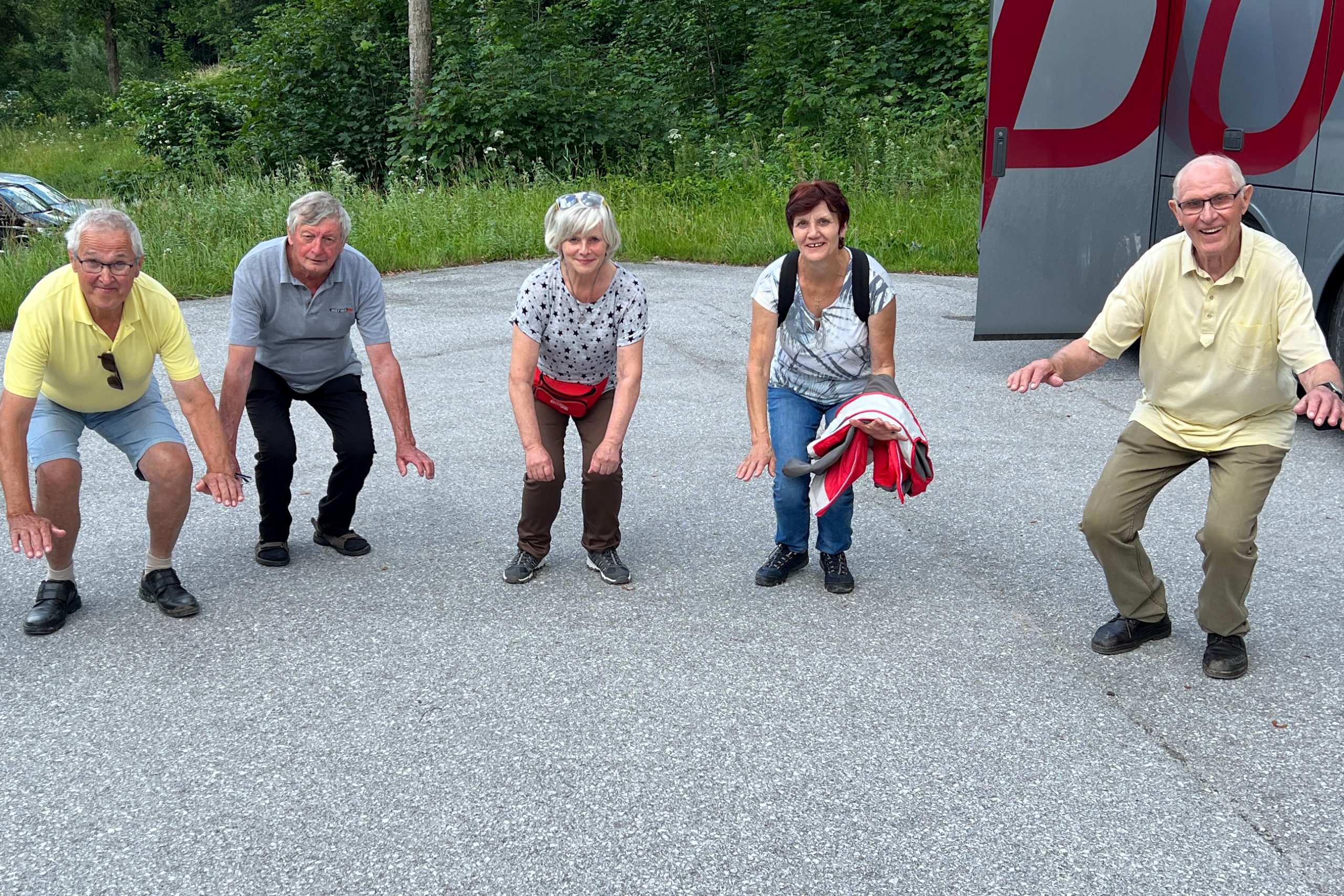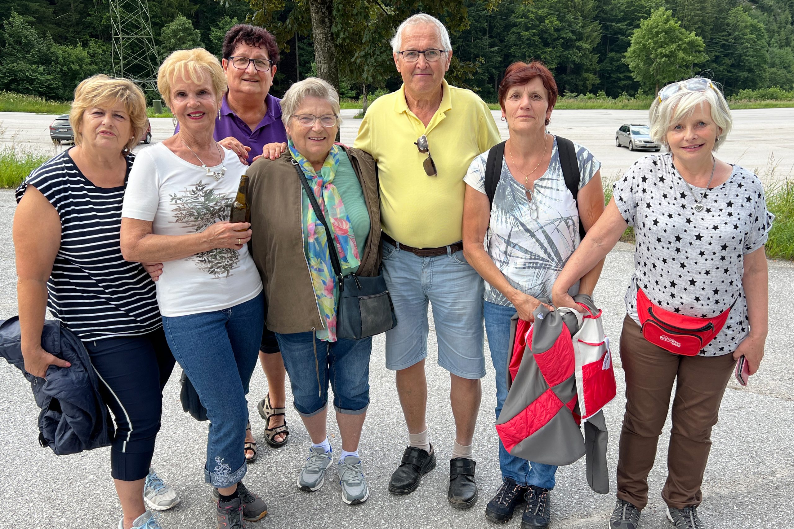 Danach wurde an vielen Tischen geschnapst, einige wanderten noch etwas in der jetzt sonnigen Höhenlage. Gemeinsam traten die Wanderer die Talfahrt an. Beim Zusammenwarten wurden die vom Wandern angespannten Beinmuskulaturen noch mit ca.90 Kniebeugen gelockert. Nach einer Gruppenaufnahme der großen Teilnehmerschar vor der „GRANDE AMORE“ wurde die Rückfahrt über den Pyhrnpass angetreten.