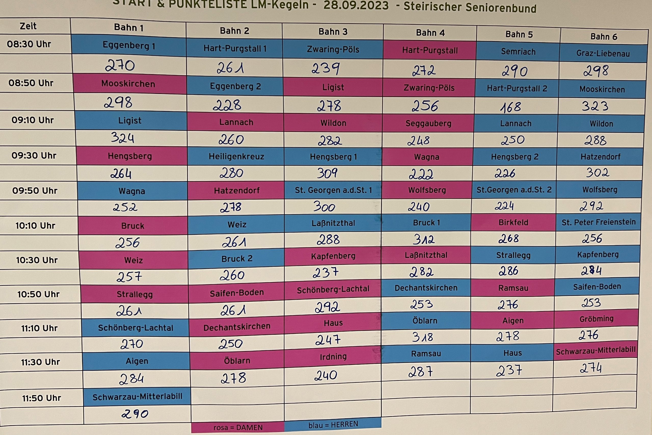 Die Mannschaftswertung der Damen haben die Mooskirchner Vertreterinnen mit 298 Kegel gewonnen und sind daher Landesmeister 2023. In der Mannschaftswertung der Herren waren mit einem Punkt Vorsprung (324) die Ligister Herren als Landesmeister siegreich, gefolgt von den Mooskirchnern mit 323 Kegeln an zweiter Stelle. Mooskirchen gratuliert der siegreichen Mannschaft aus Ligist.