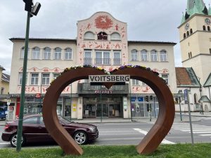 Nächster Halt vor dem Rathaus Voitsberg. Dieses wurde an seinem jetzigen Standort in den 60er Jahren des 18. Jahrhunderts erbaut. Im Jahr 2002 gestaltete Arik Brauer die Fassade mit in Bildsprache umgesetzten Sinnsprüchen.