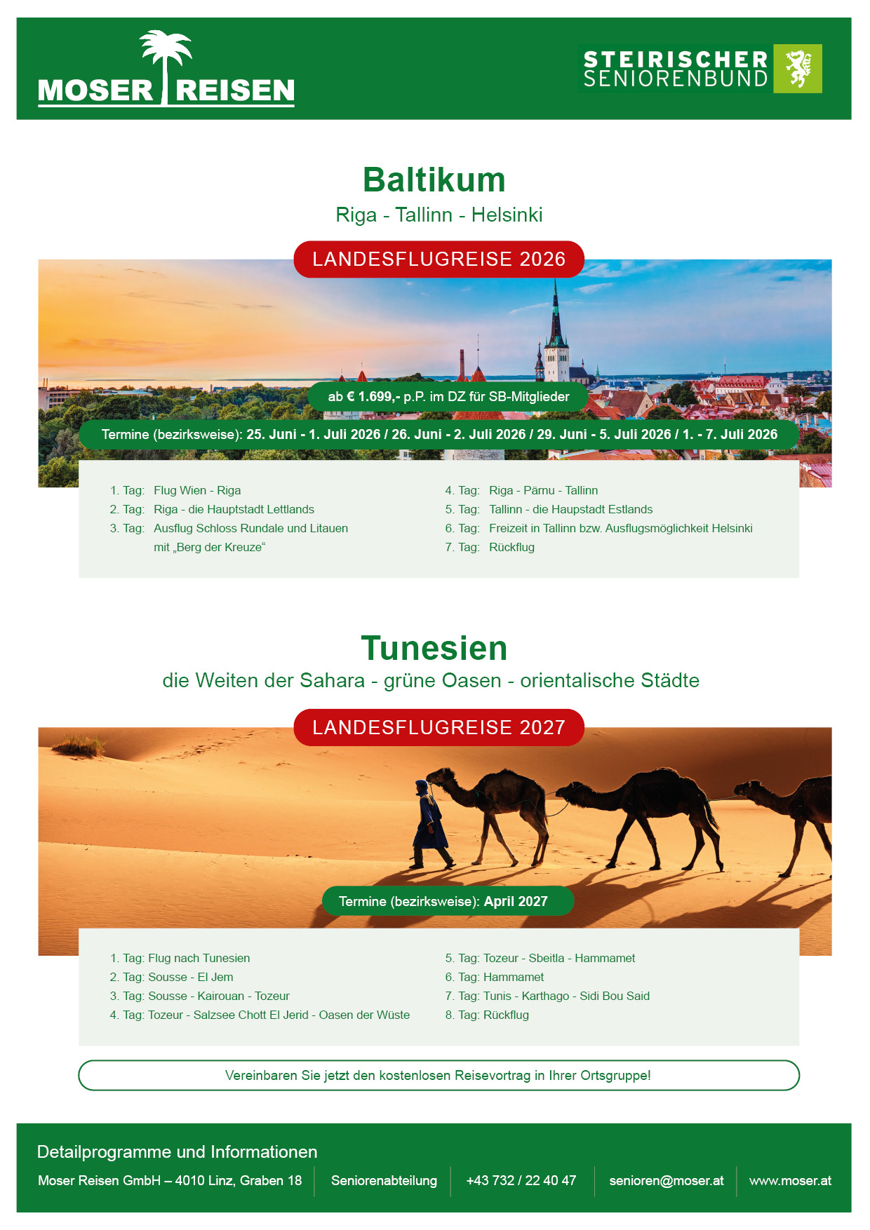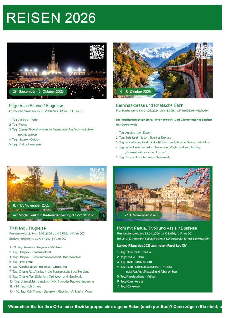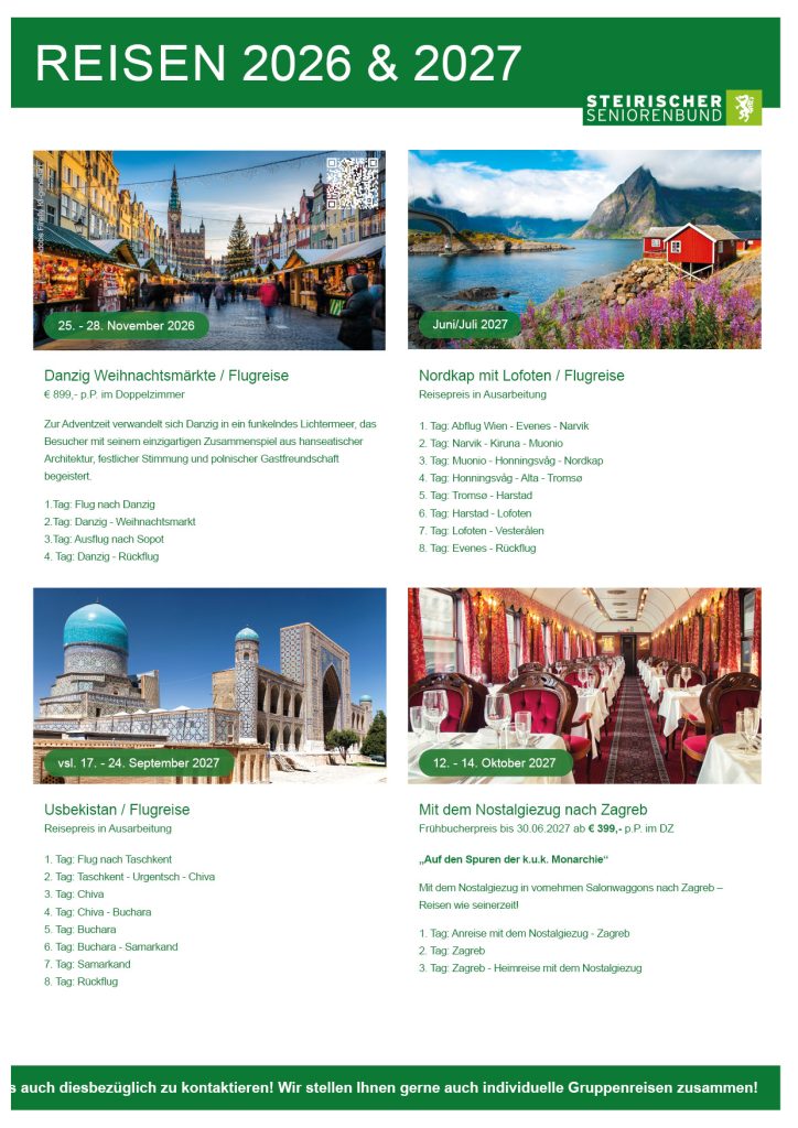 Hier finden Sie einen Überblick über die kommenden Reisen des Steirischen Seniorenbundes in Kooperation mit Moser Reisen 2026 und 2027. Von Fernreise bis Wanderreise – es ist für jeden etwas passendes dabei!