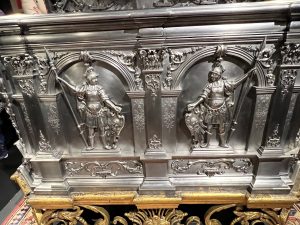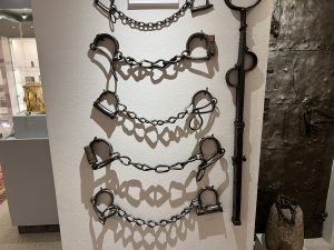 Ein weiters Thema ist die Bearbeitung des Rohstoffes Eisen. Man kann es sich kaum vorstellen, dass aus einem Stück Eisen mit Sticheln Figuren filigranster Art herausgearbeitet werden. In jedem Haushalt fand man im 17./ 18. Jahrhundert Objekte aus Eisen. Waffeleisen, Korkenpressen, Türklopfer, Beschläge aber auch Büsten. Es finden sich Instrumente des Mittelalters, wenn es galt Recht zu sprechen. Handfessel, Schandpfahl.